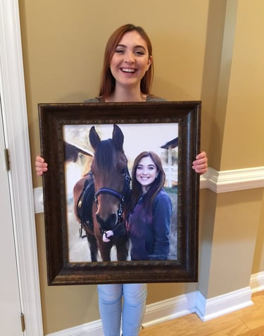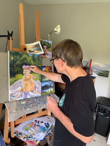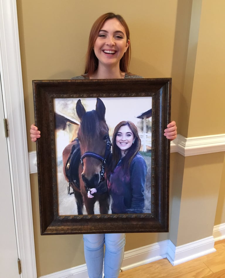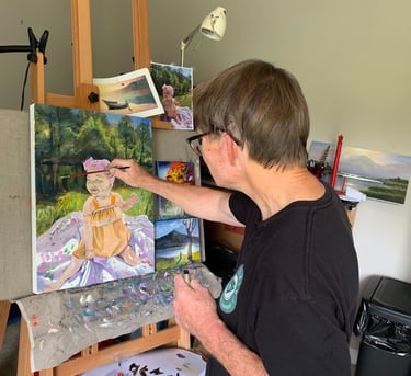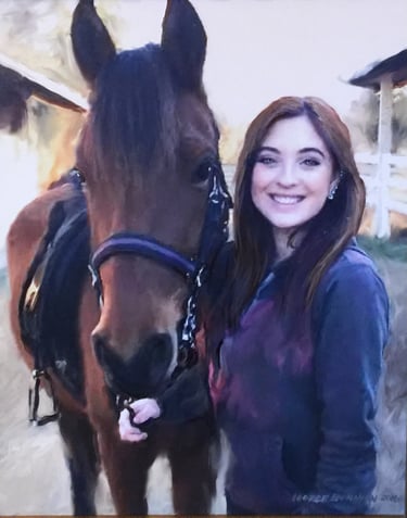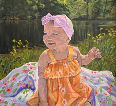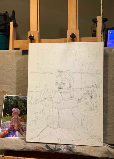 I wish I could get all of my subjects to sit still long enough to portray. I paint fast, however for children, I make use of photos. When possible, I like to include a brief sitting to make observations of eye, hair and skin colors. I begin by making a pencil drawing. Then using a small brush, the pencil lines are reinforced with burnt umber paint. Using a wide, flat, sable brush and fluid paint, I cover the background with warm colors. Then I’m ready to add layers of translucent color, in both warm and cool, to build the form, light of the background and the face. I finish with a medium, flat, sable brush to add details. In this case, I wanted the plaid shirt to showcase the brushwork by remaining painterly.