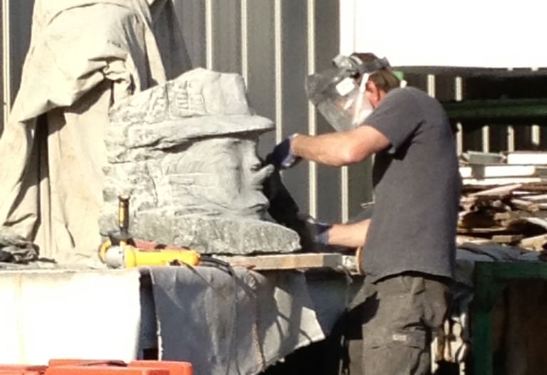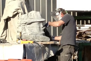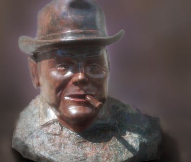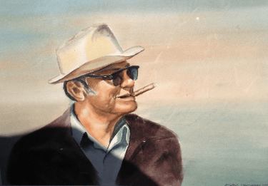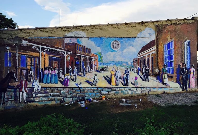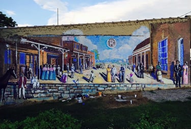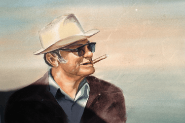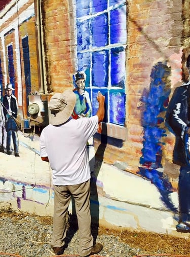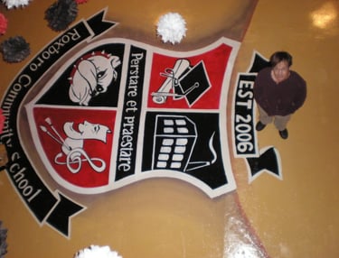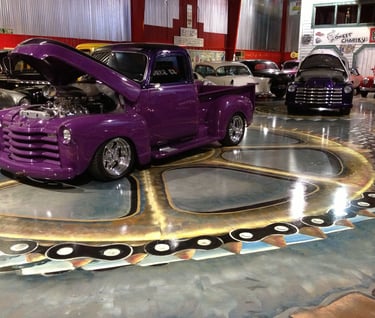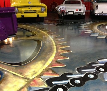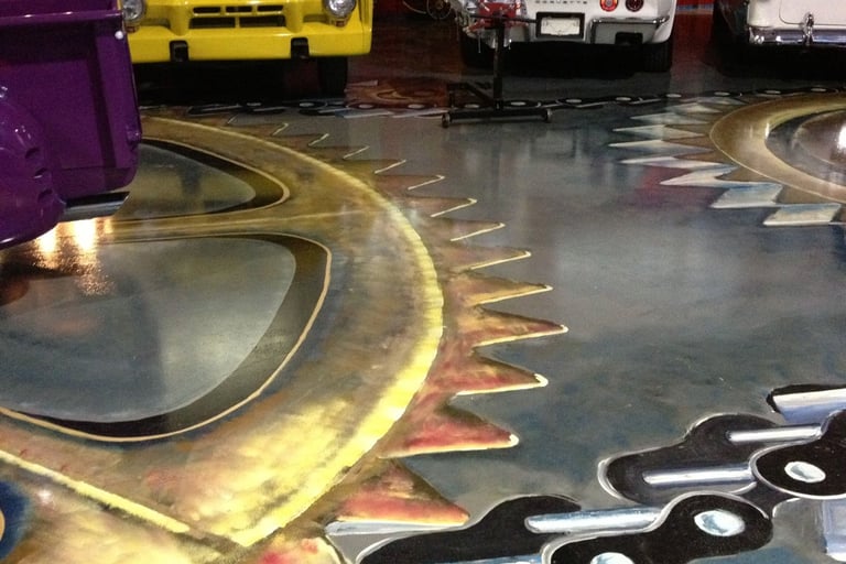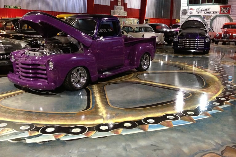 This is the warehouse floor that houses collectible vehicles. The owner of the warehouse observes the floor mural.